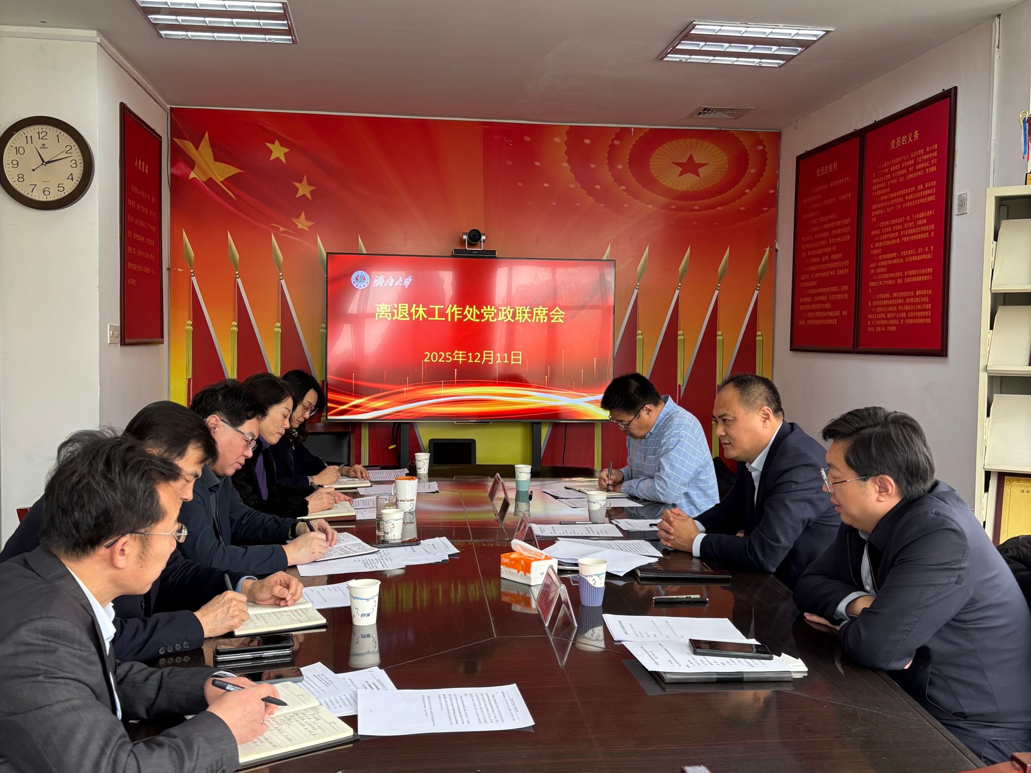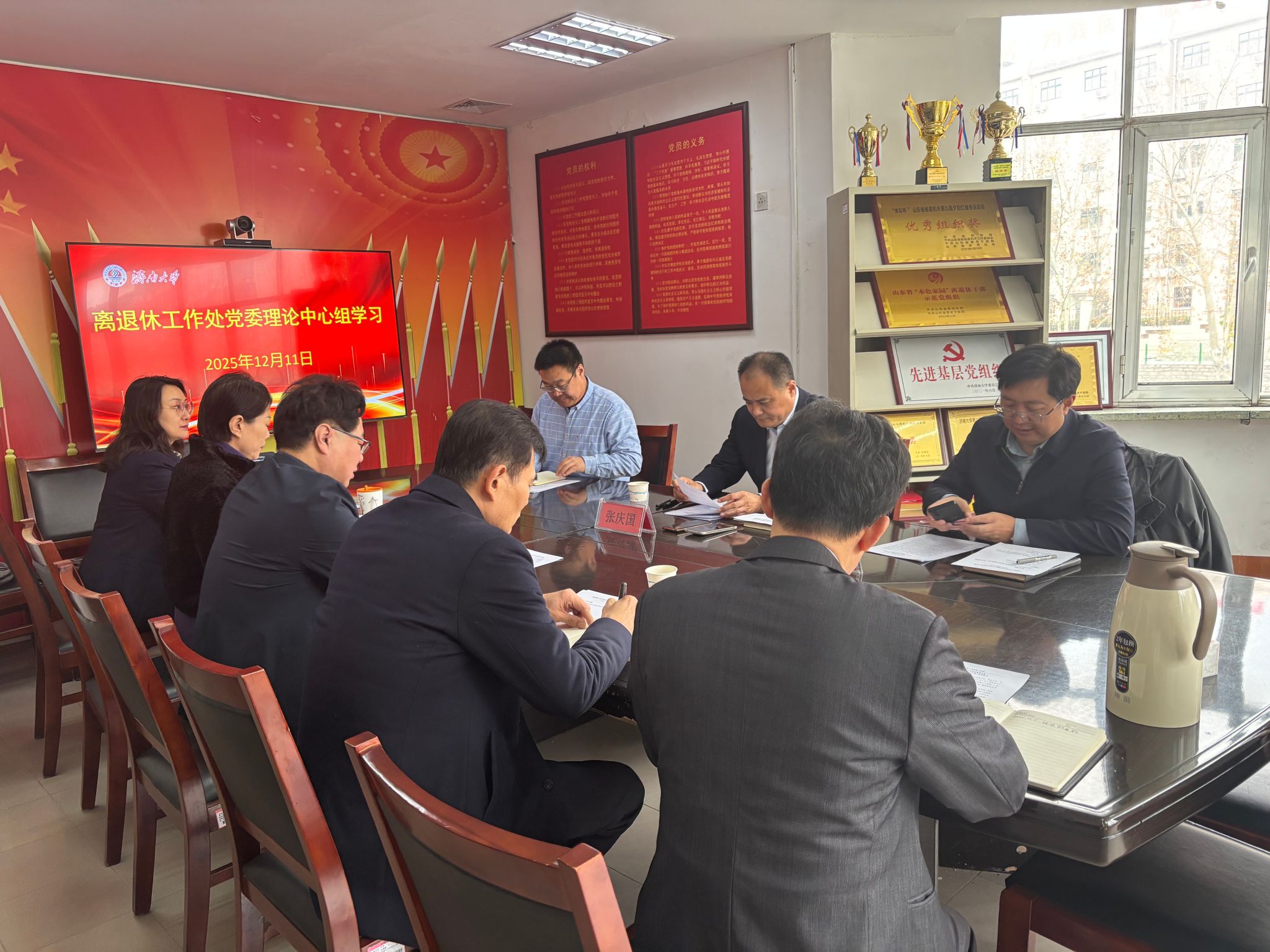 12月11日,学校党委副书记张庆国列席离退休工作处党委理论学习中心组2025年第12次集体学习、党委会以及党政联席会,党委深化改革办公室主任李元俊、党委安全保卫部副处长石卫华陪同参会。会议在离退休工作处二楼会议室举行,处全体班子成员参加。